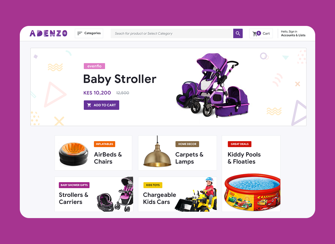 Ecommerce website for Adenzo Comfies, one of Kenya's leading Gift Shops that deals in Kids Toys, Inflatables, Kiddy Pools & Home Decor.